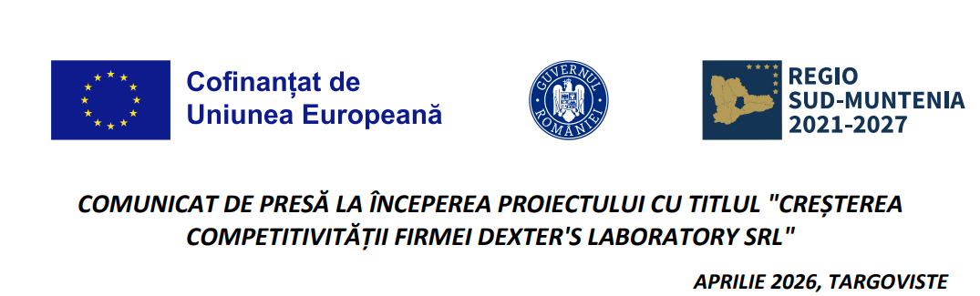 Denumirea beneficiarului: DEXTER’ S LABORATORY SRL Titlul proiectului: CREȘTEREA COMPETITIVITĂȚII FIRMEI DEXTER’ S LABORATORY SRL Număr de referință: Cod SMIS 328356, contract de finanțare nr. 734/24.03.2026 DEXTER’ S LABORATORY SRL, cu sediulsocial în Municipiul Targoviste, Str. Calea Domneasca, Nr. 292, Judet Dambovita, cod de identificare fiscală 39450493 anunță demararea implementării proiectului cu titlul „CREȘTEREA COMPETITIVITĂȚII […]