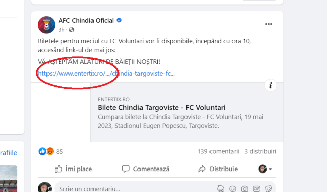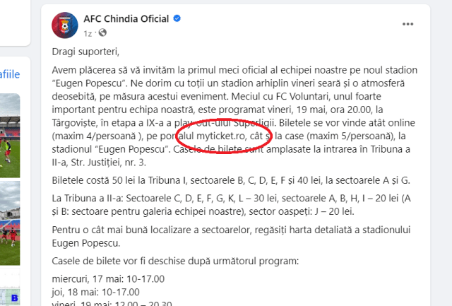 Avem plăcerea să vă invităm la primul meci oficial al echipei noastre pe noul stadion “Eugen Popescu”. Ne dorim cu toții un stadion arhiplin vineri seară și o atmosferă deosebită, pe măsura acestui eveniment. Meciul cu FC Voluntari, unul foarte important pentru echipa noastră, este programat vineri, 19 mai, ora 20.00, la Târgoviște, în etapa a IX-a a play-out-ului Superligii. Biletele se vor vinde atât online (maxim 4/persoană ), pe portalul myticket.ro, cât și la case (maxim 5/persoană), la stadionul “Eugen Popescu”. Casele de bilete sunt amplasate la intrarea în Tribuna a II-a, Str. Justiției, nr. 3. “ suna anuțul postat pe pagina de Facebook a AFC Chindia Târgoviște