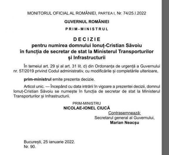 Dâmbovițeanul Ionuț Săvoiu, vicepreședinte PSD Dâmbovița, a fost numit în funcția de secretar de stat în cadrul Ministerului Transporturilor și Infrastructurii. Decizia a fost luată în ședința de Guvern de ieri, 25 ianuarie. Documentul semnat de premierul Nicolae Ciucă a fost publicat în Monitorul Oficial.