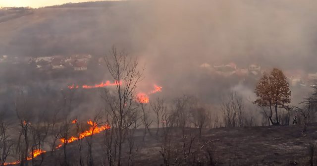 Se acționează în mai multe puncte pentru a opri înaintare a focului către locuințe și pădurea din apropiere.