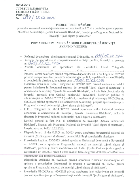 Astăzi, 25.02.2026 Primăria comunei Crângurile, anunță deschiderea procedurii de transparență decizională a procesului de elaborare a proiectului următorului act normativ: proiect de hotărâre privind aprobarea documentației tehnico-economice faza P.T. și a devizului general pentru obiectivul de investiție ”Școala Gimnazială Bădulești”, finanțat prin Programul Național de Investiții ”Școli sigure și sănătoase”.
