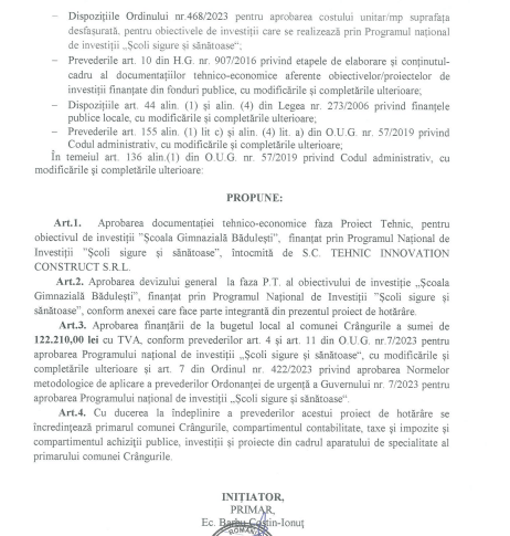 Materialele transmise vor purta mențiunea „Propuneri privind proiectul de hotărâre privind aprobarea documentației tehnico-economice faza P.T. și a devizului general pentru obiectivul de investiție ”Școala Gimnazială Bădulești”, finanțat prin Programul Național de Investiții ”Școli sigure și sănătoase””.