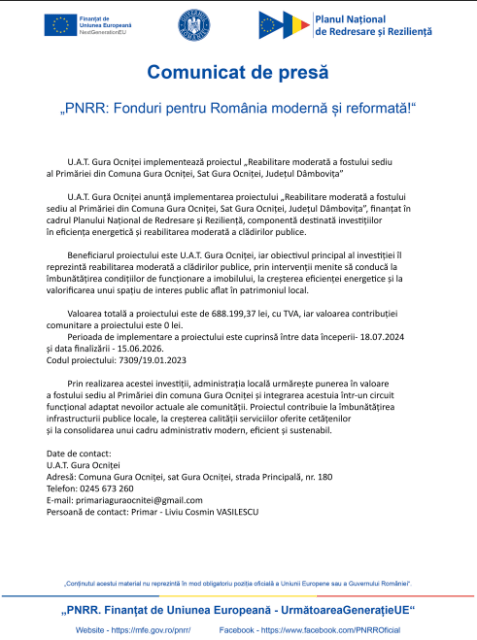 UAT GURA OCNIȚEI, COMUNICAT DE PRESĂ „PNRR: Fonduri pentru România modernă și reformată!”